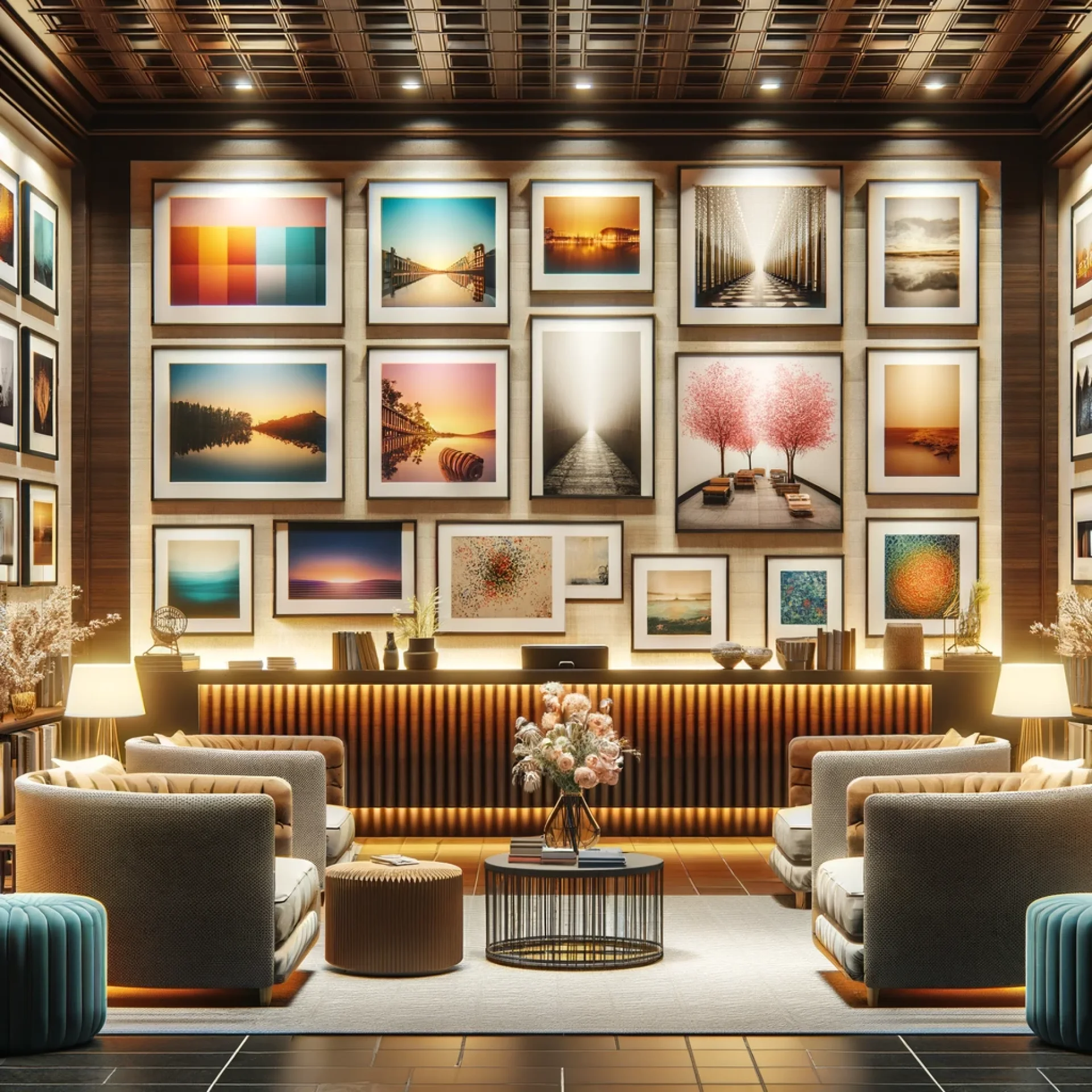 - ล็อบบี้โรงแรม ที่ตกแต่งด้วยภาพดิจิตอลที่ใส่กรอบ ซึ่งแสดงถึงการผสมผสานของความสง่างามและการต้อนรับ ภาพที่เลือกสะท้อนถึงความหลากหลายทางวัฒนธรรมและความงามธรรมชาติ ช่วยสร้างบรรยากาศที่อบอุ่นและมีระดับสำหรับผู้ที่เยือน